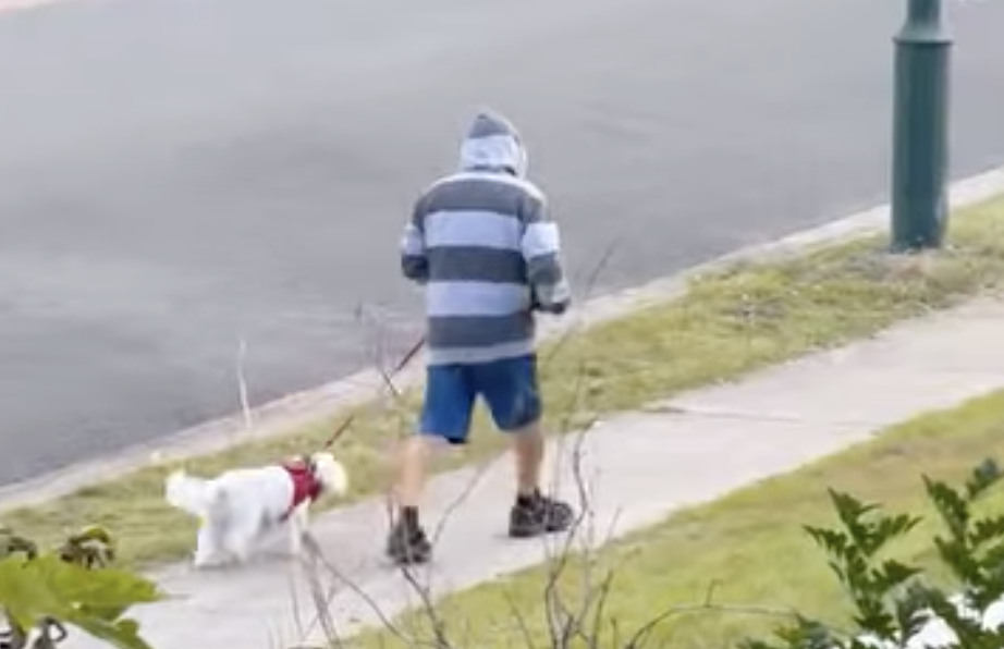 According to the homeowner, the man was walking a small, white fluffy dog —possibly a Bichon Frisé — when he entered the backyard and plucked a ripe papaya from a tree. The man’s stealthy demeanour suggested he knew what he was doing, as he was dressed in a striped grey hoodie with the hood pulled up and wore sunglasses, seemingly to obscure his identity.
