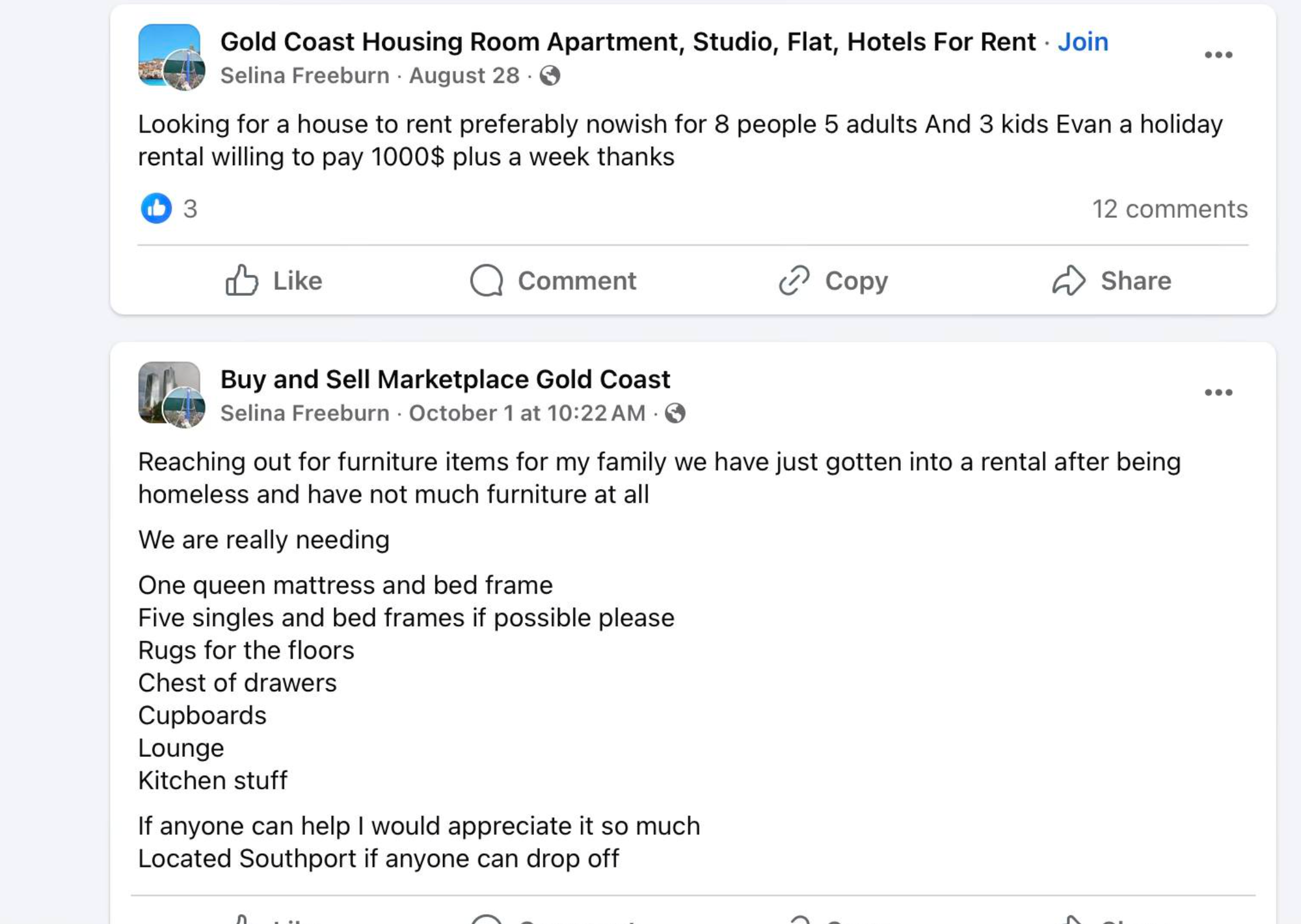 The Gold Coast community is being urged to stay vigilant against a known scammer who has allegedly been deceiving generous and well-meaning residents for years. The individual, whose real name and identity remain uncertain (believed to actually be Tianne Isaac), operates under multiple aliases and frequently posts fabricated stories online to solicit cash, goods, and other forms of assistance from kind-hearted locals.