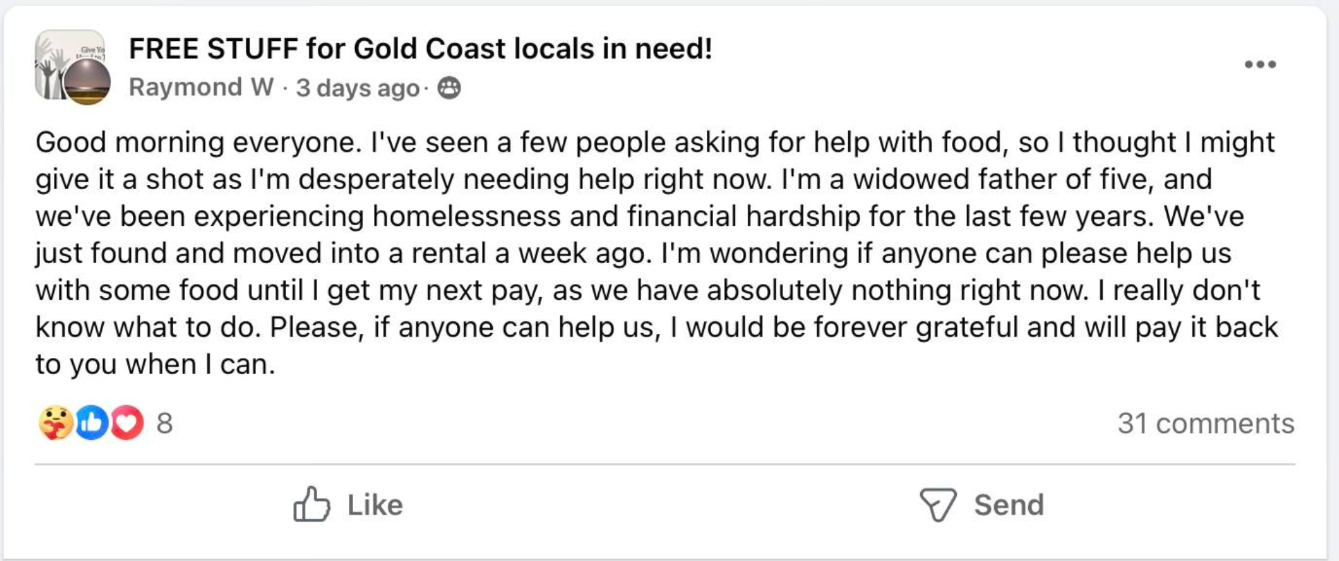 According to numerous community reports, this individual has been preying on the goodwill of Gold Coast residents by presenting sob stories, often involving claims of homelessness or financial hardship. Common narratives used include: